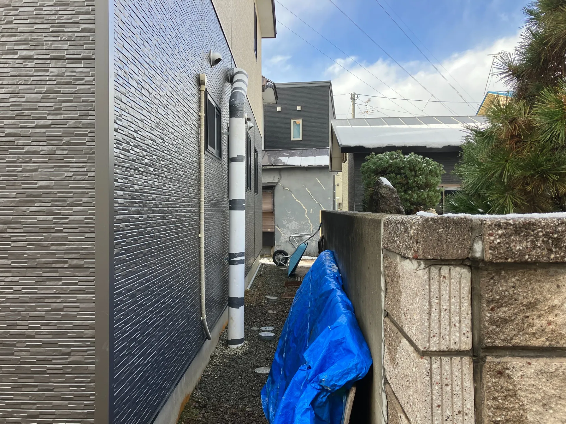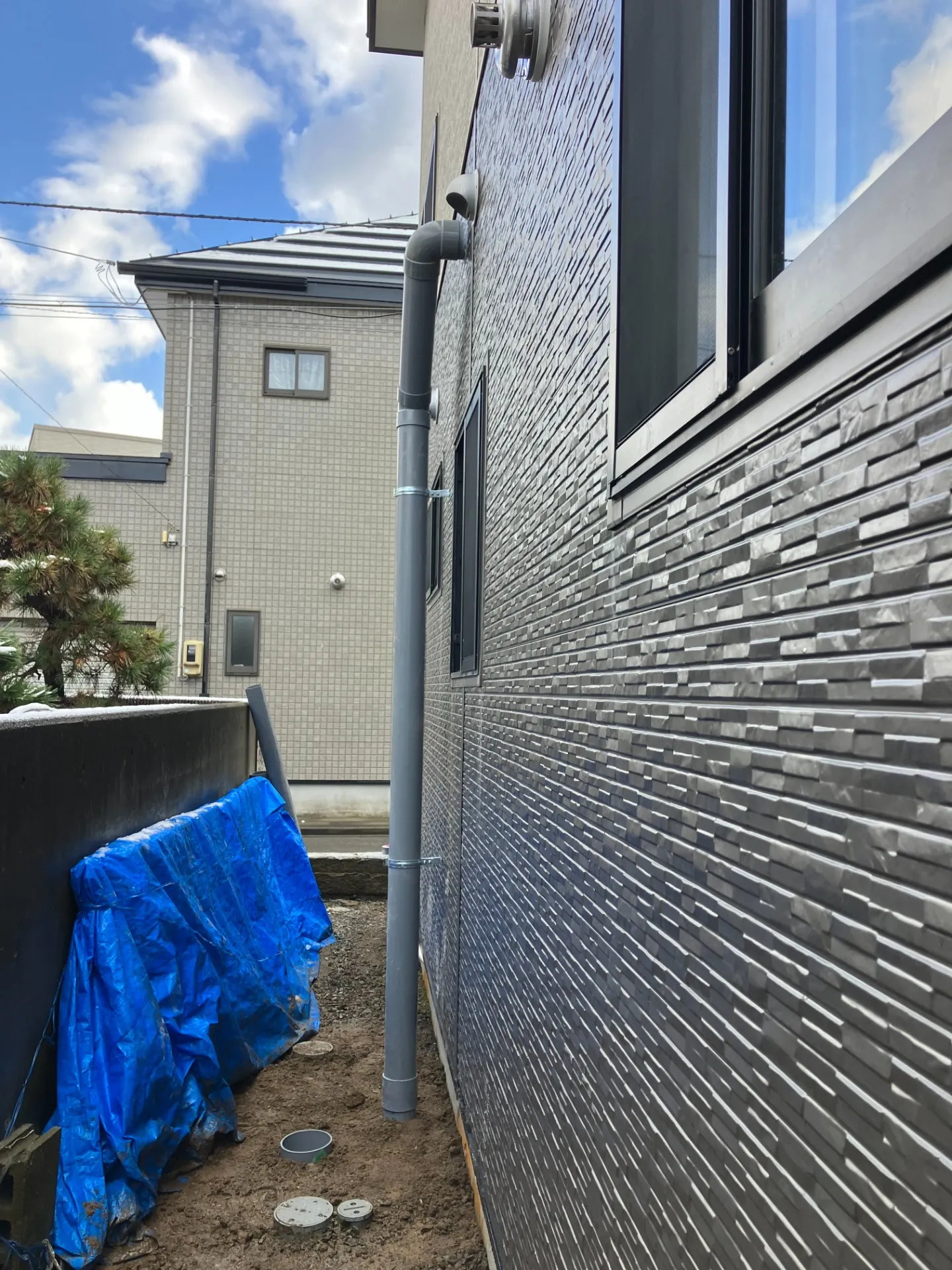 写真は昨年施工した工事ですが、ユニットバスの交換工事を行った際に、2階のトイレの排水配管が既設ユニット内に通っており、新しくなるユニットの中にはそのパイプが収まらないということで、外部に露出で新しく配管し直してきました。私の工事はここまでですが、最後は大工さんがパイプの周りを囲ってくれています。